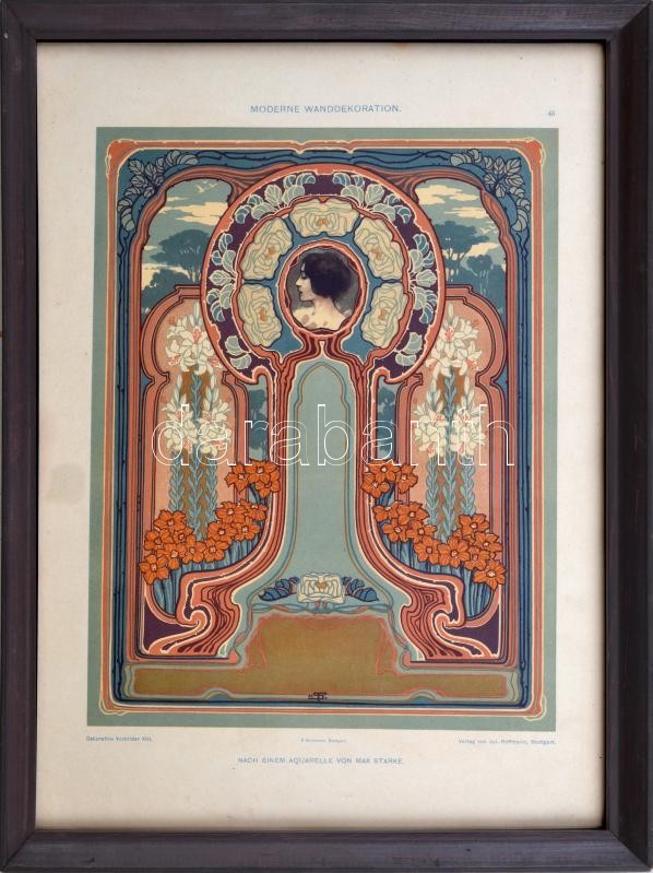cca 1905 Jugendstil (szecessziós) modern fali dekoráció, a Dekorative Vorbilder sorozatból, Max Starke akvarellje után, nyomat, papír. 34x25 cm, üvegezett fakeretben