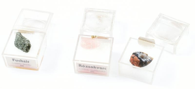 Beschreibung: 3 db különféle ásvány, nagyítós műanyag dobozban
