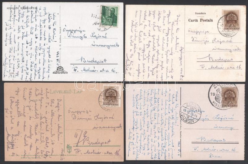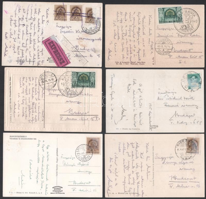 1935-1943 Dinnyés Lajos (1901-1961) politikus, miniszterelnök saját kezű sorai feleségének különféle képeslapokon, 10 db, 3 hátoldalán visszatért bélyegzésekkel.
