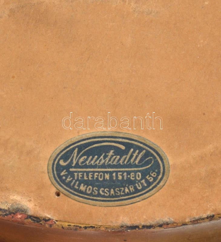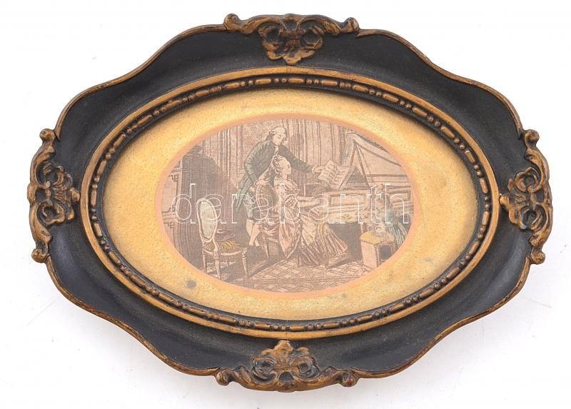 Dekoratív, régi üvegezett ovális fakeret, aranyszínű paszpartuval, színezett zongoralecke vászonképpel (?). Hátoldalán Neustadtl Ernő képkeretező 1930-35 körüli címkéjével. Belső méret kb. 8x13,4 cm