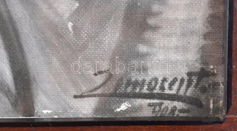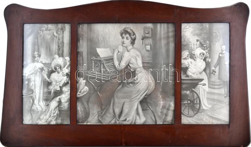 Szecessziós stílusú, nagyméretű, három részre osztott üvegezett, kissé kopott régi fakeret, nyomattal, belső méret: 42x42 (középső rész), 21,5x42,8 cm (két szélső része).