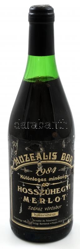 Beschreibung: 1984 Hosszúhegyi Merlot 1984, muzeális bor, hajós-bajai borvidék, szakszerűen tárolt bontatlan palack vörösbor, kopott, a címkén sérülésnyomokkal, 0,75l.
