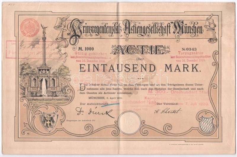 German Empire / München 1910. "Prinzregentenplatz Aktiengesellschaft München" share about 1000 Mark with embossed stamp and overprints C:F spotted