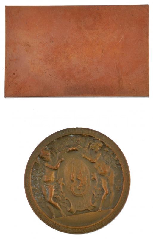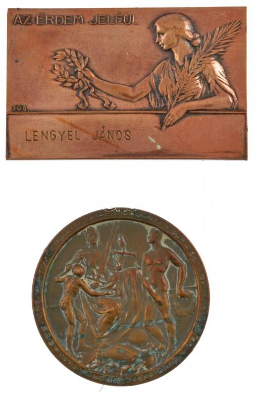 1912. "Budapest Székesfőváros Közlekedési Részvénytársaság Sportegyesülete a sport terén elért kiváló kiváló érdemek jutalmazására - 1912 / Concordia parvaeres crescunt discordia maximae dilabuntur durateet vosmet rebus servate secundis" bronz érdemérem (40mm) + ~1900. "Az érdem jeléül - Lengyel János" bronz érdemplakett (56x36mm) T:2,2-