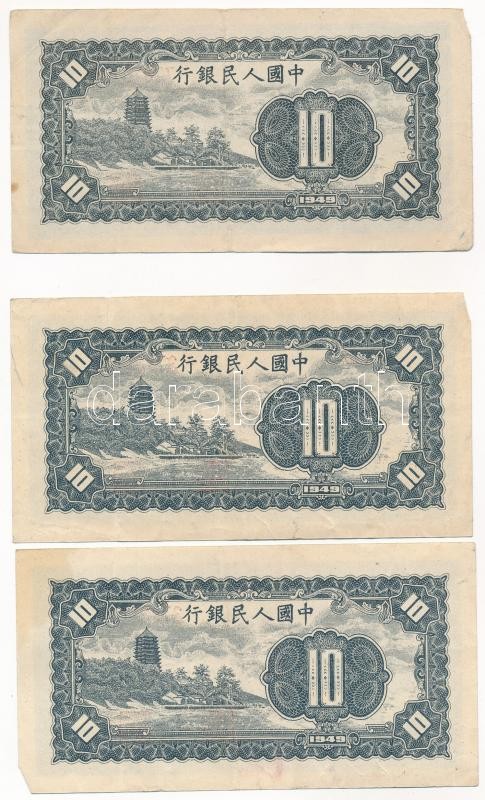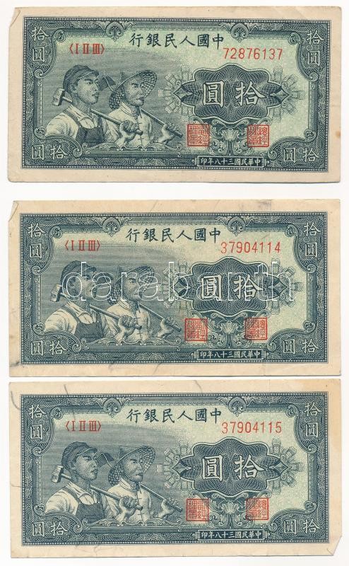 Kínai Köztársaság 1949. 10Y (3x) ezek közül 2 sorszámkövető "37904114-37904115" T:III folt, ceruzás firka