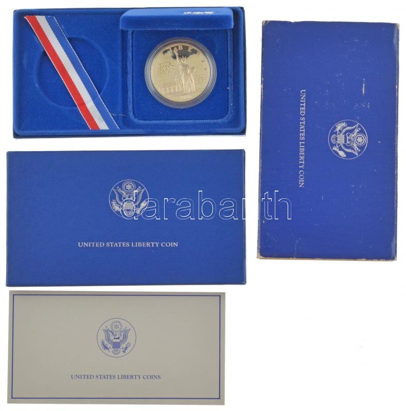 Amerikai Egyesült Államok 1986S 1$ Ag "Szabadság-szobor" angol nyelvű tanúsítvánnyal, az eredeti 3 db-os szett díszcsomagolásában T:PP ujjlenyomat, patina