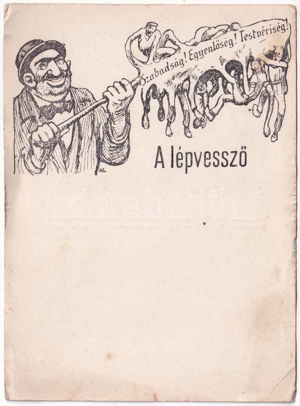 A lépvessző. Szabadság! Egyenlőség! Testvériség! Gúnyos antiszemita propaganda lap. Felelős kiadó Nagykálnai Levatich László. Held János könyvnyomdája / Anti-Semitic propaganda card, mocking art postcard. Judaica (EB)