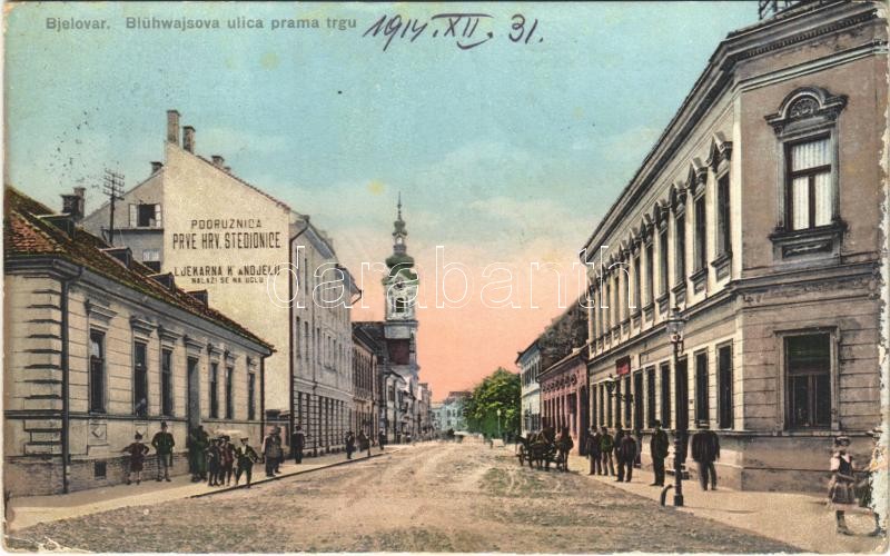1915 Belovár, Bjelovar; Blühwajsova ulica prama trgu, Podruznica Prve Hrv. Stedionce, Ljekarna K. Andjelu / utcakép, templom, gyógyszertár reklámja a falon / street view, church, pharmacy's advertisement on the wall (EK)