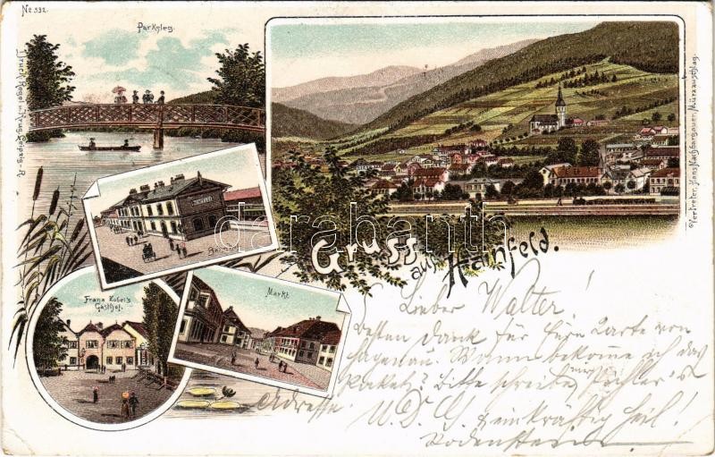 1897 (Vorläufer!) Hainfeld, Parksteg, Bahnhof, Markt, Franz Zobel's Gasthof / park, railway station, market, inn, hotel. Regel & Krug Art Nouveau, floral, litho (EK)