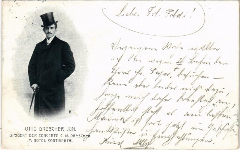 1902 Otto Drescher jun. Dirigent der Concerte C. W. Drescher im Hotel ... https://www.darabanth.com/de/425-Fernauktion/425.0/Ansichtskarten/Personlichkeiten~2000029/1902-Otto-Drescher-jun-Dirigent-der-Concerte-C-W-Drescher-im-Hotel-Continental~II2707306