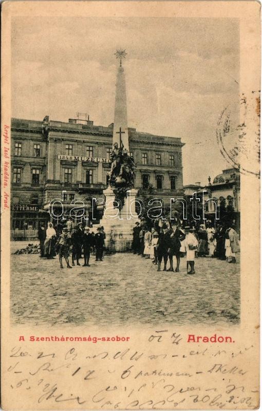 1902 Arad, Szentháromság szobor, 1848 Múzeum, színházi étterem. Kerpel... https://www.darabanth.com/de/425-Fernauktion/425.0/Ansichtskarten/Siebenburgen~2000006/1902-Arad-Szentharomsag-szobor-1848-Muzeum-szinhazi-etterem-Kerpel-Izso-kiadasa-Trinit~II2712686