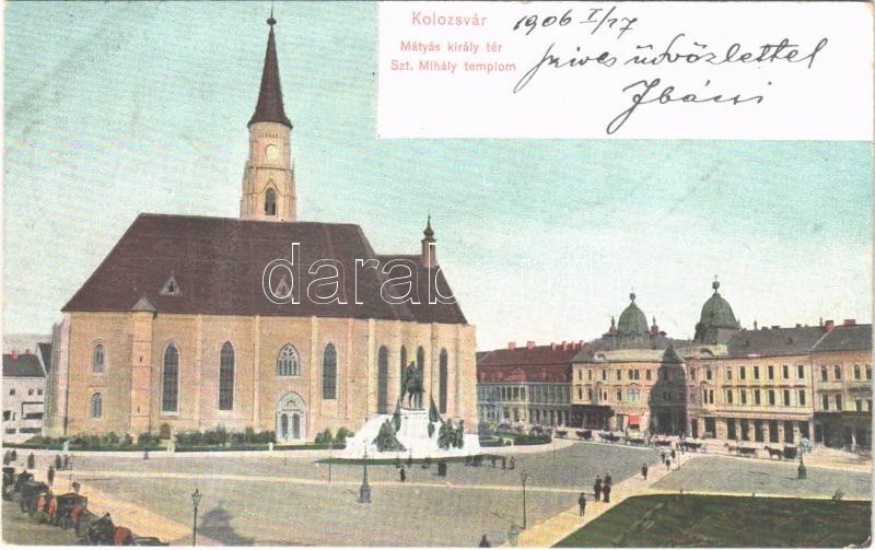 1906 Kolozsvár, Cluj; Mátyás király tér, Szent Mihály templom, Mátyás ... https://www.darabanth.com/de/425-Fernauktion/425.0/Ansichtskarten/Siebenburgen~2000006/1906-Kolozsvar-Cluj-Matyas-kiraly-ter-Szent-Mihaly-templom-Matyas-kiraly-szobor-squar~II2349443