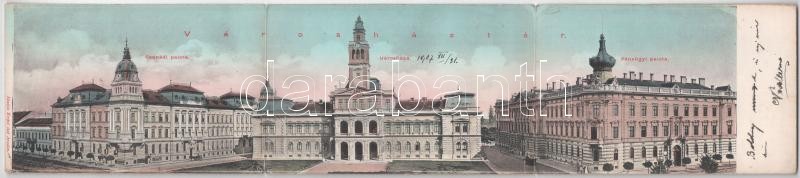 Beschreibung: 1907 Arad, Városház tér, Csanádi palota, Pénzügyi palota, Városháza. Kerpel Izsó kiadása. 3-részes kihajtható panorámalap / town hall, financial palace. 3-tiled folding panoramacard (kis szakadás / small tear)
