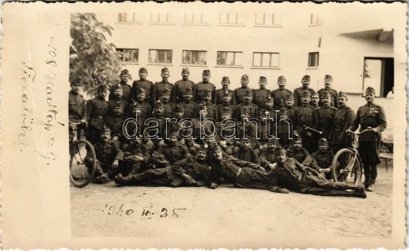 Beschreibung: 1940 Dés, Dej; A tiszalöki 108. Hadtáp zlj. csoportképe, kerékpár / Hungarian military, group of soldiers, bicycle. photo (fa)