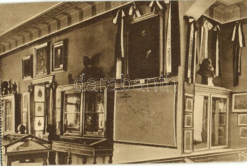 Arad, Ereklyemúzeum, a II. terem nyugati része, vegyes emléktárgyak és a szabadságharc hadi utainak térképe. Kiadja Kerpel Izsó 69. sz. / relic museum of the Hungarian Revolution in 1848-1849, interior, map - képeslapfüzetből / from postcard booklet