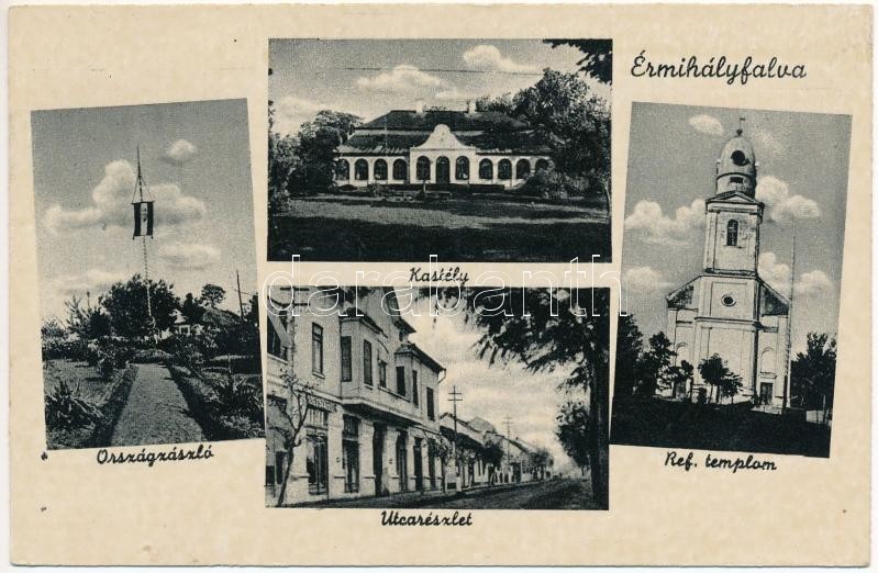 Beschreibung: Érmihályfalva, Valea lui Mihai; országzászló, kastély, utca, református templom. Weinstock 6166. / Hungarian flag, castle, street, Calvinist church