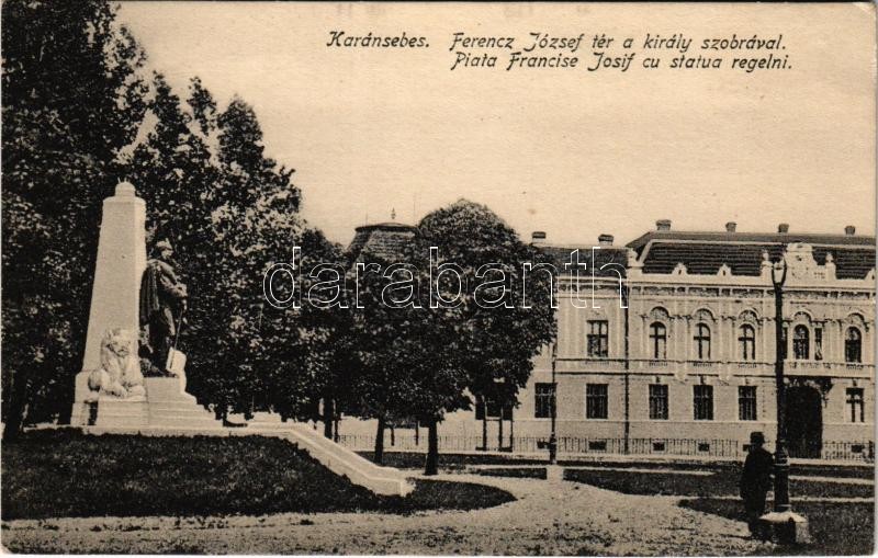 Karánsebes, Caransebes; Ferenc József tér a király szobrával / Franz Josefs-Monument / Piata Francise Josif cu statua regelni / square, statue of Franz Joseph I of Austria