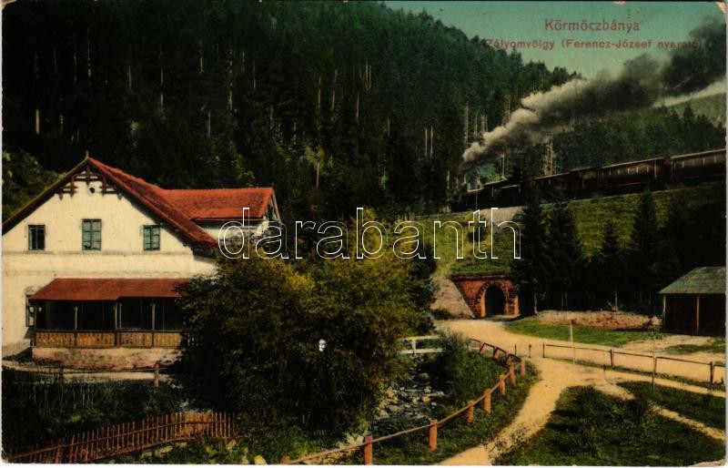 Beschreibung: 1912 Körmöcbánya, Kremnitz, Kremnica; Zólyomvölgy, Ferenc József nyaraló, vasút, gőzmozdony. Ritter Lipót kiadása / valley, villa, locomotive, railway tunnel