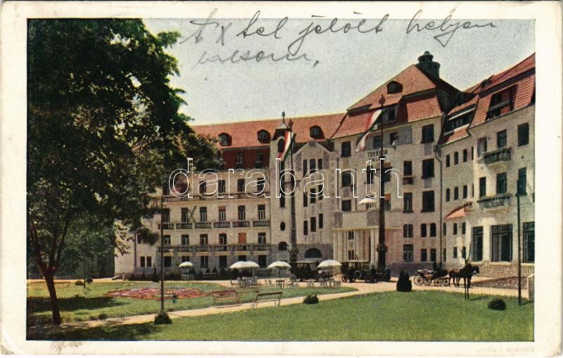 Beschreibung: 1917 Pöstyén, Pistyan, Piestany; Thermia Palace szálloda, automobilok, magyar zászlók. Rigler r.-t. / hotel, automobiles, Hungarian flags (EK)