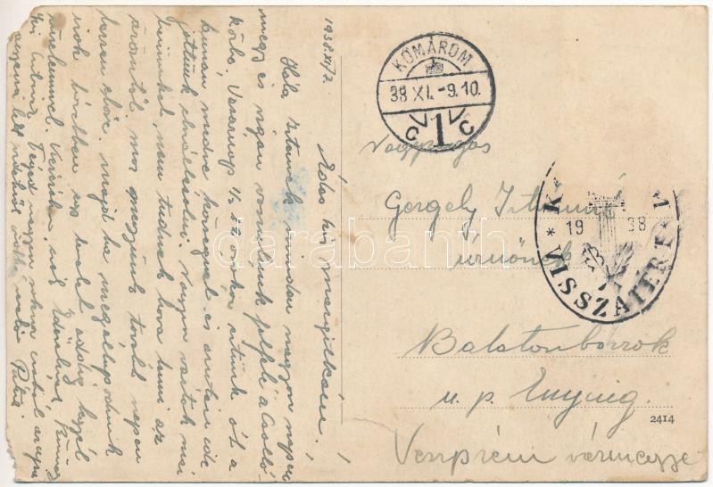 Beschreibung: 1938 Alistál, Hrobonovo, Dolny Stál; Római katolikus templom és iskola / Catholic church and school + "1938 Komárom visszatért" So. Stpl. (b)