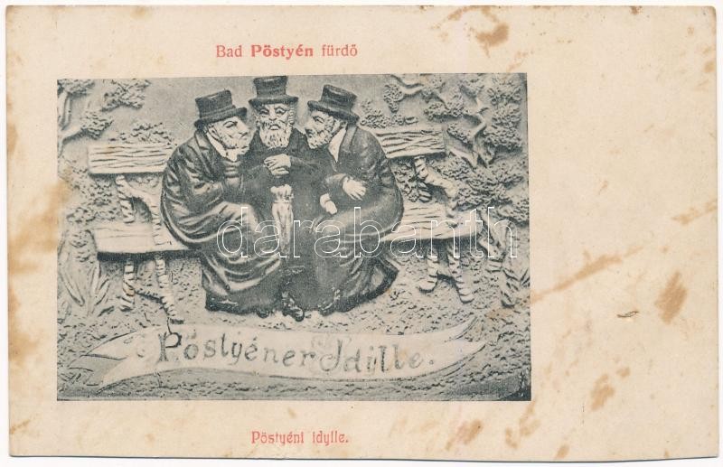 Pöstyén, Pistyan, Piestany; Zsidó férfiak, judaika / Pöstyéner Idyll. Eigenthum und Verlag A. Bernas / Jewish men sitting on a bench. Judaica art postcard (fl)