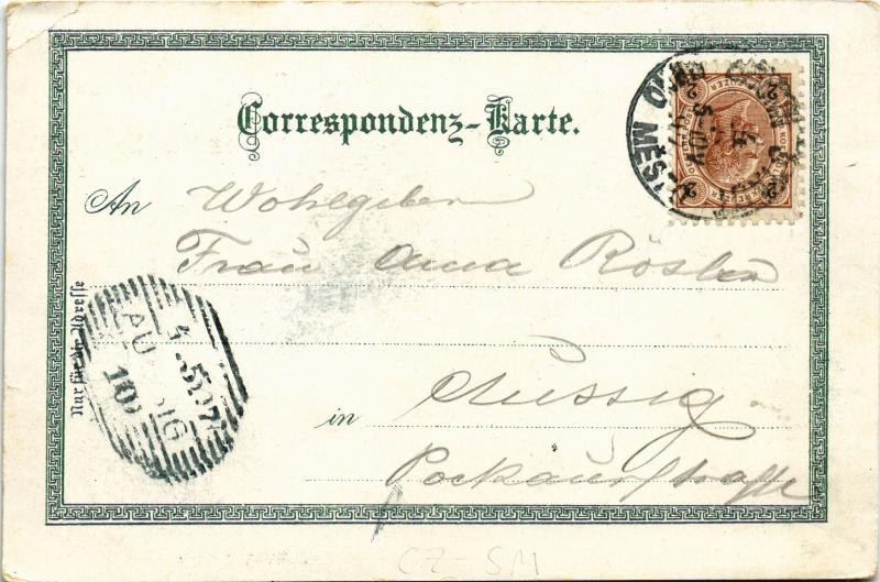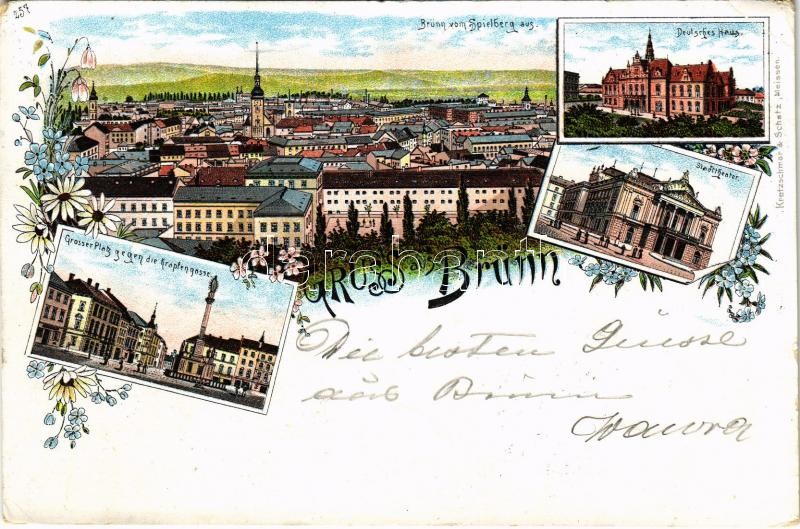 1897 (Vorläufer!) Brno, Brünn; Deutsches Haus, Grosser Platz gegen die Krapfengasse, Stadttheater / German House, square, street view, theatre. Kretzschmar & Schatz Art Nouveau, floral, litho (EK)