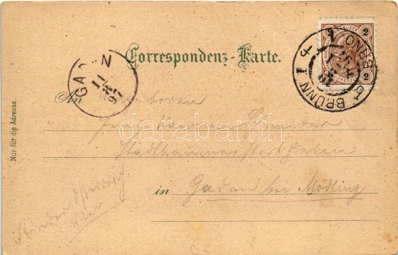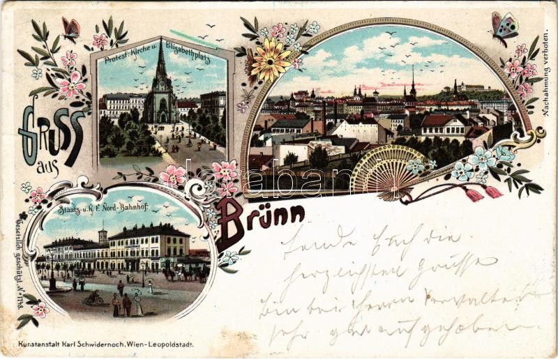 1897 (Vorläufer!) Brno, Brünn; Protest Kirche u. Elisabethplatz, Staats- u. K. F. Nord-Bahnhof / church, square, railway station. Karl Schwidernoch Art Nouveau, floral, litho (EK)