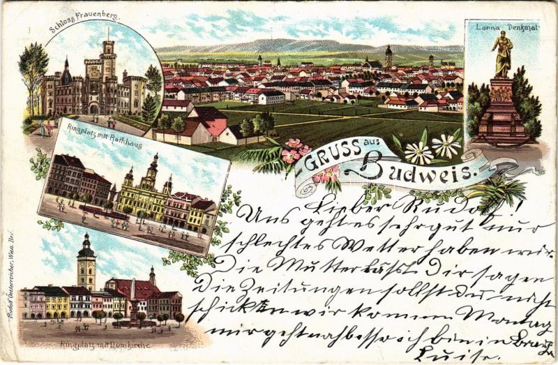 1897 (Vorläufer!) Ceské Budejovice, Budweis; Schloss Frauenberg, Ringplatz mit Rathaus, Domkirche, Lanna Denkmal / castle, main square, town hall, church, monument. Rudolf Österreicher Art Nouveau, floral, litho (EK)