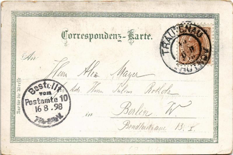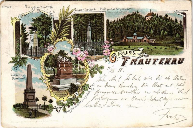 1898 (Vorläufer)Trutnov, Trautenau; Preussen-Denkmal, Wowes Denkmal, Stadtpark m. Kapellenberg, Gablenz-Monument, Walzel'scher-Militär-Friedhof / monuments, chapel, military cemetery. Verlag v. Georg Lorenz. Art Nouveau, floral, litho (EK)
