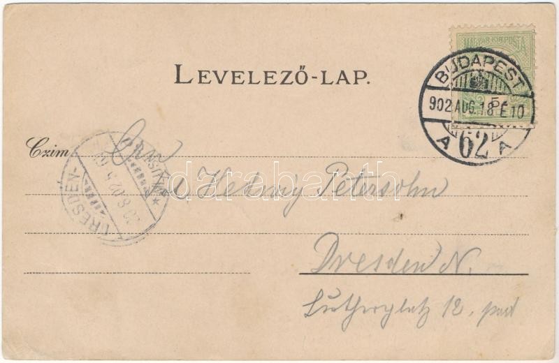 Beschreibung: 1902 Budapest székesfőváros. Pest-Pilis-Solt-Kis-Kun megye címere és magyar zászló. Athenaeum Rt. kőnyomdája, Art Nouveau, floral, litho (EB)