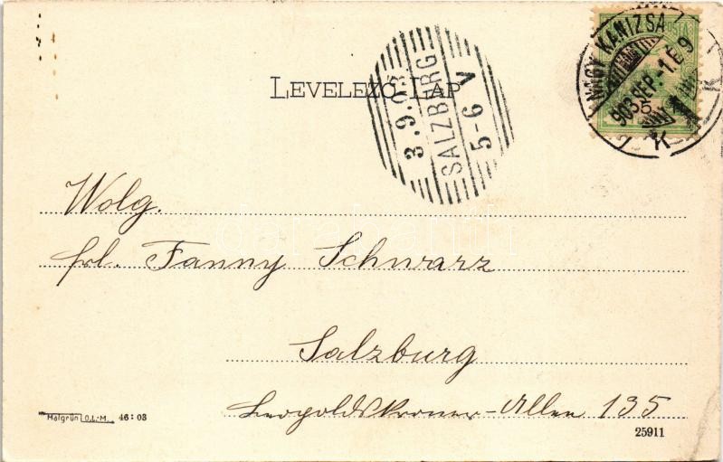 Beschreibung: 1903 Nagykanizsa, madártávlatból, Franz féle gőzmalom. Schless Antal kiadása. Art Nouveau, floral (EB)