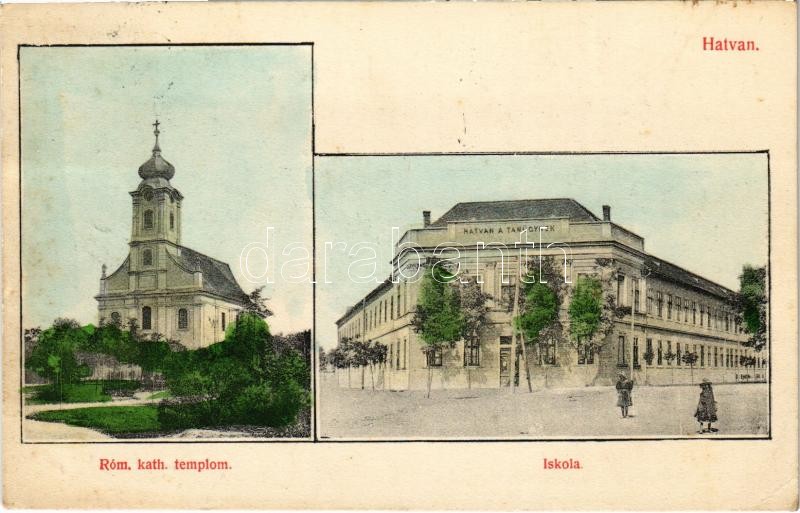Beschreibung: 1910 Hatvan, Római katolikus templom, iskola. Jatzkó Lajos kiadása (EK)
