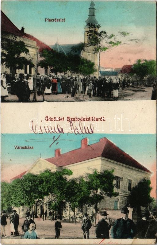 Beschreibung: 1911 Szabadszállás, Piac részlet, templom, Városháza. Stern Vilmos kiadása (EK)