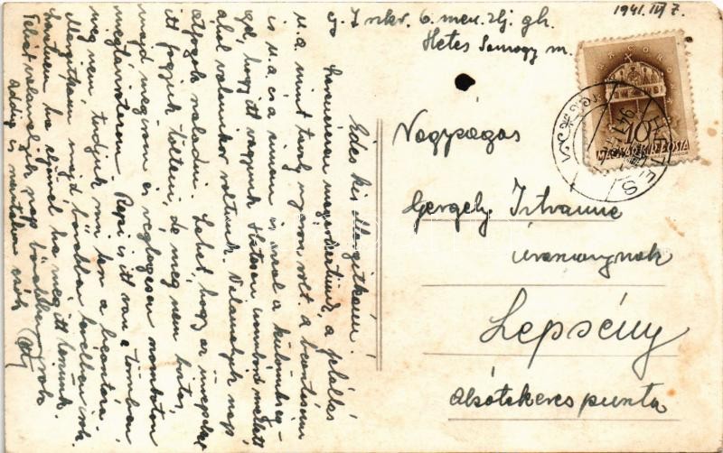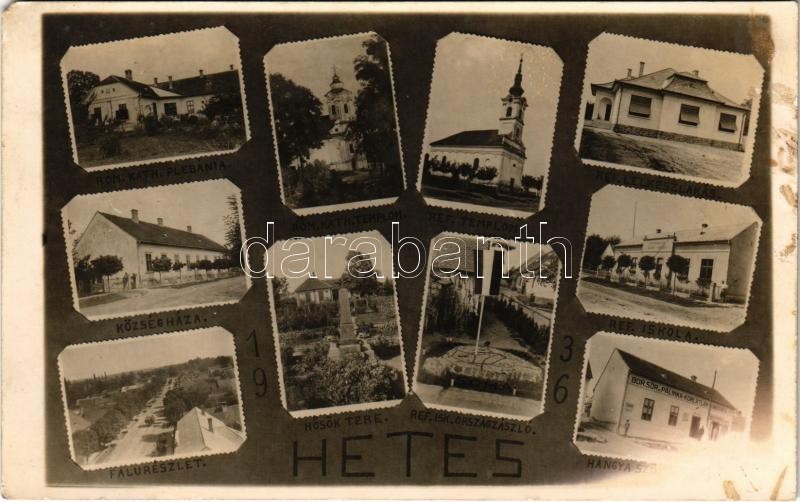 1941 Hetes, Római katolikus templom és plébánia, Református templom, lelkészlakás és iskola, falu részlet, községháza, Hősök tere, Országzászló, Hangya Szövetkezet üzlete. photo (EM)