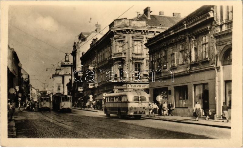 Beschreibung: 1954 Miskolc, Állami könyvesbolt, villamos, autóbusz. Képzőművészeti Alap Kiadóvállalat