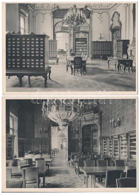 Budapest VIII. Fővárosi Könyvtár, belső. Erdélyi cs. és kir. udv. fényképész felvételei - 8 db régi képeslap / 8 pre-1945 interior postcards of the library