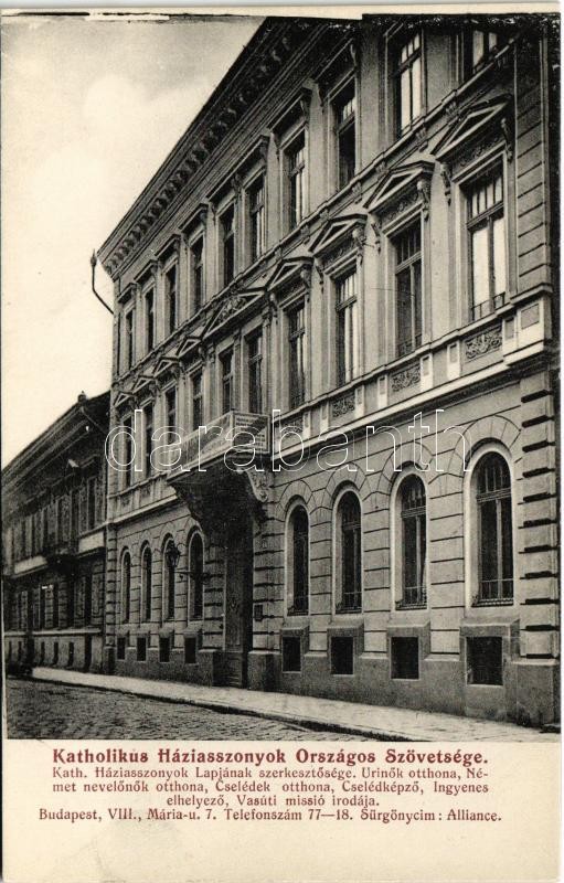 Budapest VIII. Katolikus Háziasszonyok Országos Szövetségének háza, Vasúti misszió központi irodája, Úrinők otthona, cselédképző. Szödényi Árpád kiadása. Mária utca 7.