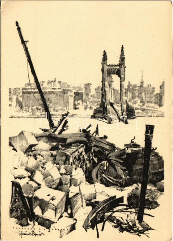 Beschreibung: Budapest, a felrobbantott Erzsébet híd. Második világháború utáni romok. Felelős kiadó: Jánossy Árpád s: Pfannl Egon (EK)