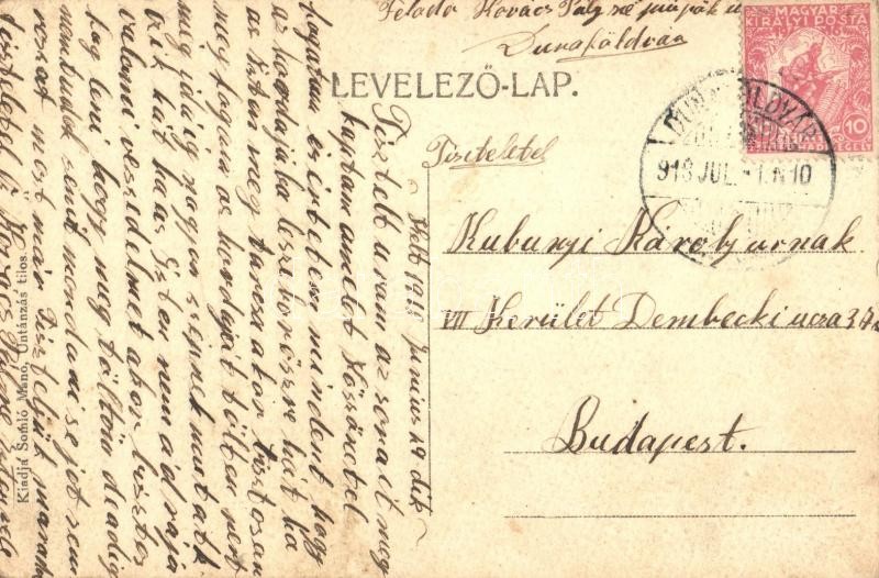 Beschreibung: Dunaföldvár, Rákóczi utca, Községháza, templom Dávid-csillaggal. Kiadja Somló Manó (EK)