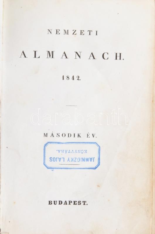 Nemzeti almanach. 1842. Második év. Bp., 1842. (Magyar Királyi Egyetem betűivel.) 1 t. (címkép, Barabás Miklós rajza, Carl Mahlknecht metszete), (2)+316+(4)p.+8t. (acélmetszetek). Korabeli, hiányzó gerincű, szétesett fűzésű vászonkötésben
