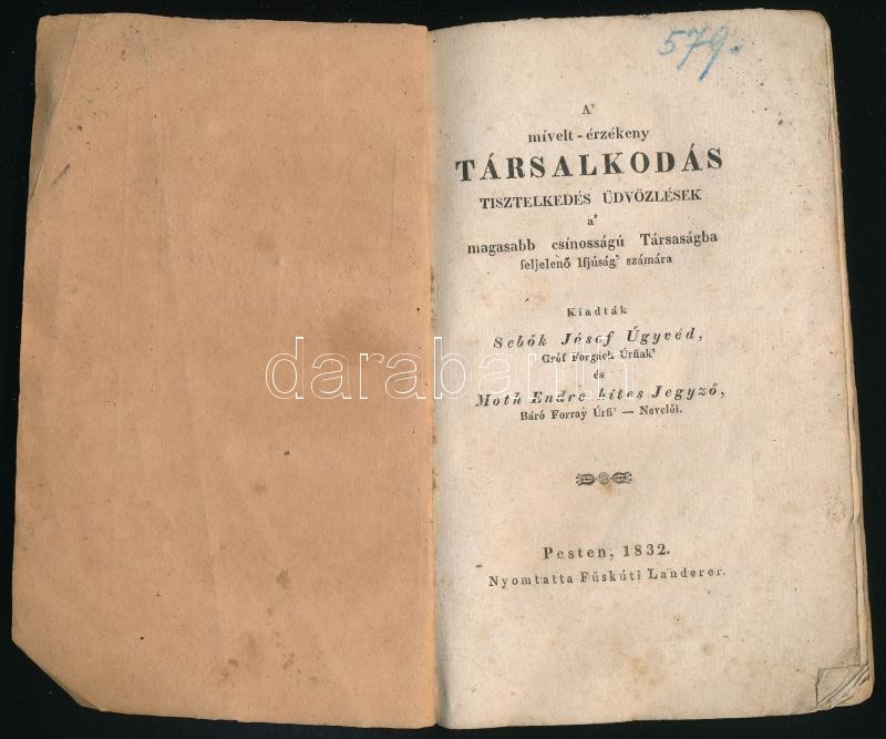 Kiadták ~ ~ ügyvéd, Gróf Forgách Úrfiak' és ~ ~ hites jegyzÅ‘, Báró Forray Úrfi'-NevelÅ‘i. a' magasabb csÃnosságú Társaságba feljelenÅ‘ Ifjúság' számára. Pesten, 1832. Fűskúti Landerer. 140 p. Kiadói, sérült papÃrkötésben