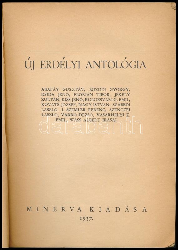 Uj erdélyi antológia. Kolozsvár, 1937. Minerva, Kiadói papírkötésben, ... https://www.darabanth.com/de/425-Fernauktion/425.0/Bucher/Bucher-Andere-kuriositaten~1000023/Uj-erdelyi-antologia-Kolozsvar-1937-Minerva-Kiadoi-papirkotesben-kisse-szakadt~II2710091