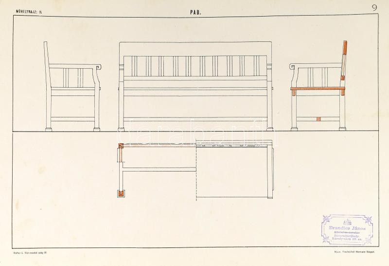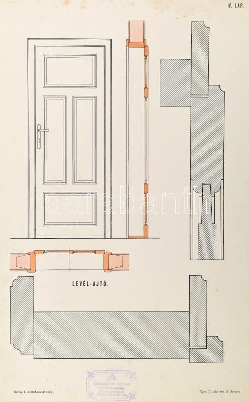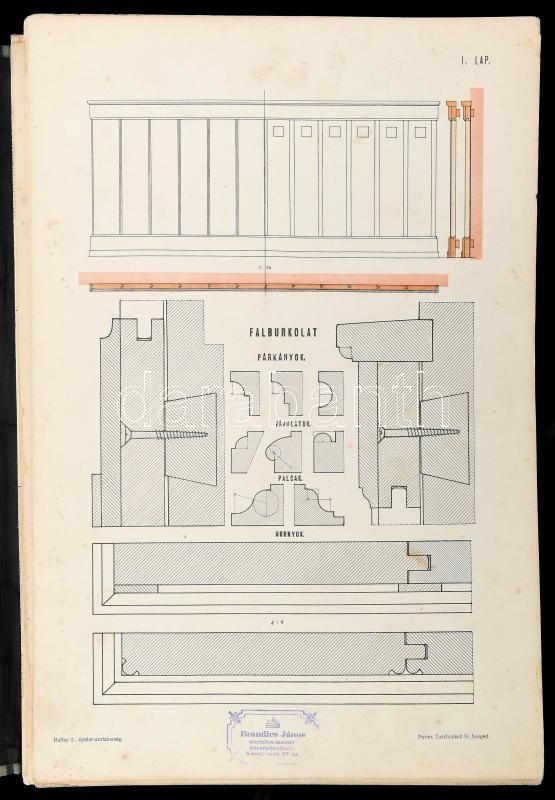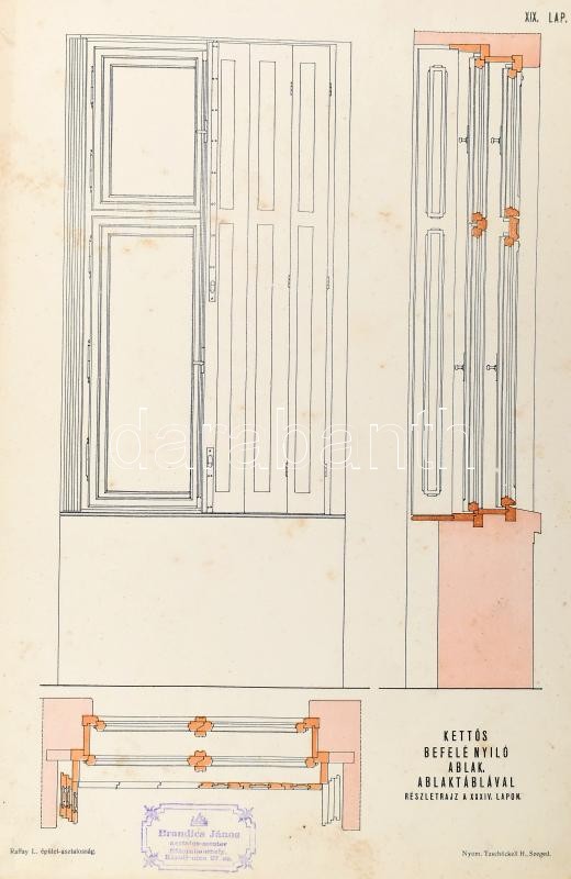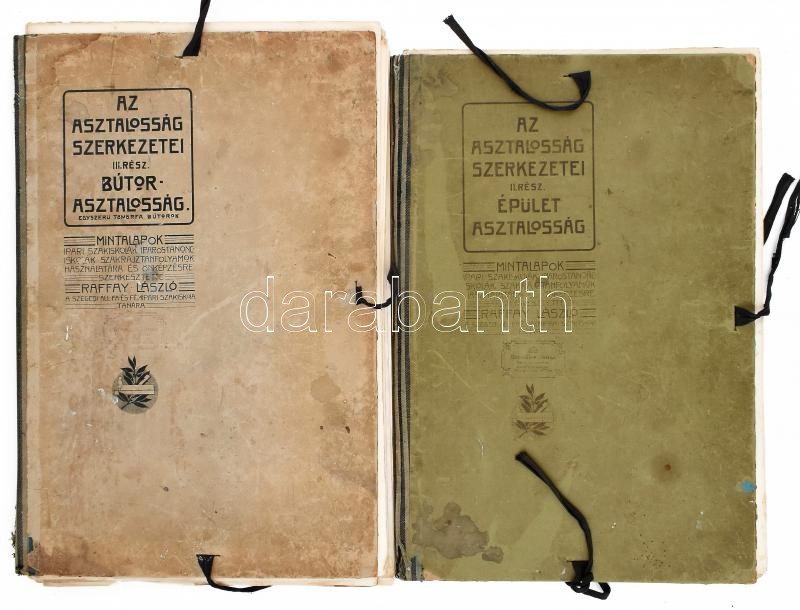 Az asztalosság szerkezetei. (II-III. rész). Mintalapok ipari szakiskolák, iparostanonc-iskolák, szakrajztanfolyamok használatára és önképzésre. Szerk.: Raffay László. II. rész: Épületasztalosság. III. rész: Bútorasztalosság. Szeged, é.n. (cca 1900-1910), Tzschöckell H.-ny. Képtáblák (műhelyrajzok), viseltes kiadói félvászon mappában, helyenként foltokkal, kissé sérült lapszélekkel, Brandics János sátoraljaújhelyi asztalosmester bélyegzőivel.