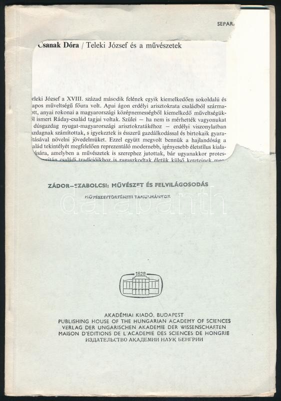 F. Csanak Dóra: Teleki József és a művészetek. Bp., é.n., Akadémiai. 553-584 p. Különlenyomat Fekete-fehér képekkel illusztrált. Kiadói sérült papírborítóban.