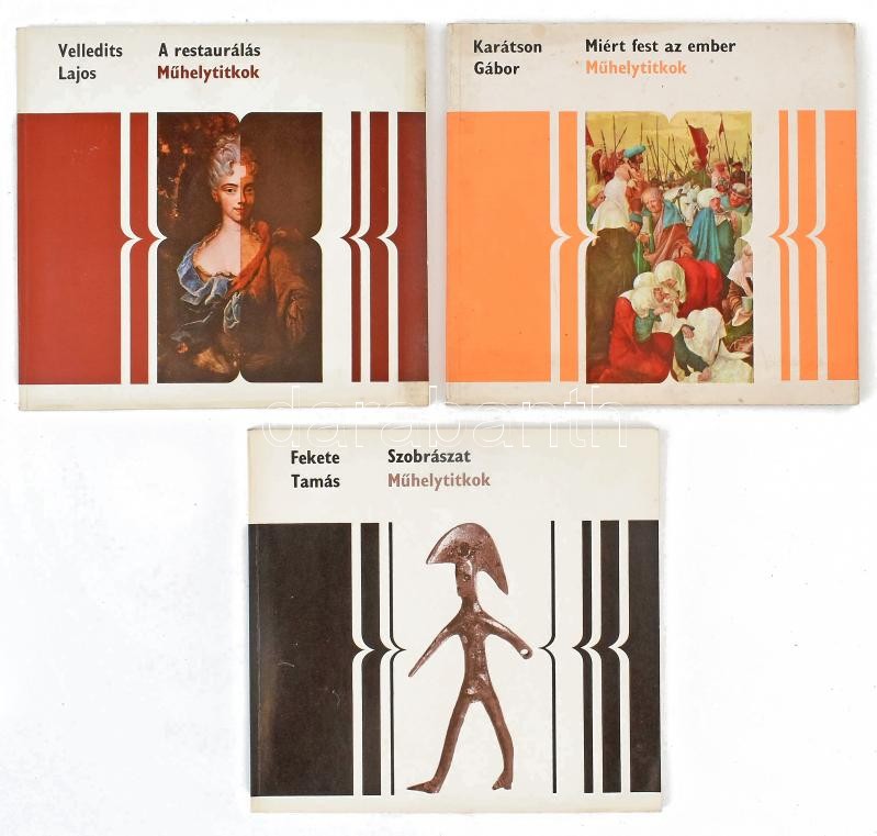 Műhelytitkok sorozat 3 kötete: Fekete Tamás: Szobrászat; Velledits Lajos: A restaurálás; Karátson Gábor: Miért fest az ember. Bp., 1970-1982, Corvina. Kiadói papírkötés.