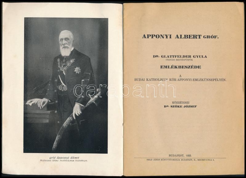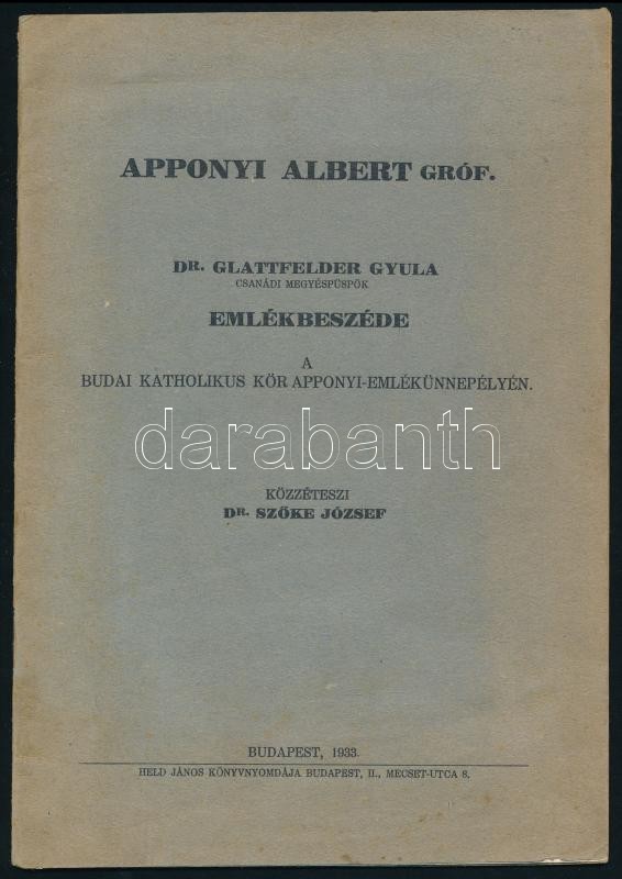 Glattfelder Gyula: Apponyi Albert gróf. Dr. - - csanádi megyéspüspök emlékbeszéde a Budai Katholikus Kör Apponyi-emlékünnepélyén. Közzéteszi Dr. Szőke József. Bp., 1933, Held János-ny., 1 (Apponyi Albert) t.+24 p. Kiadói papírkötés