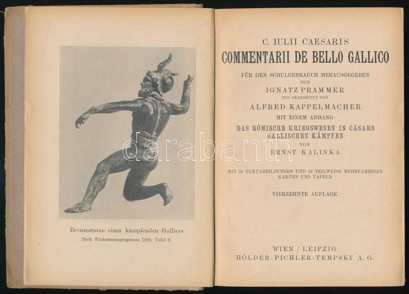 Prammer, Ignatz - Kappelmacher, Alfred: C. Iuli Caesaris Commentarii de Bello Gallico. [Julius Caesar feljegyzései a gall háborúról]. Mit einem Anhang Das römische Kriegswesen in Cäsars gallischen Kämpfen von Ernst Kalinka. Wien-Leipzig, (1928), Hölder-Pichler-Tempsky A.G. Fekete-fehér és színes képtáblákkal, térképekkel illusztrálva. Német nyelven. Kiadói félvászon-kötés, kissé sérült borítóval.