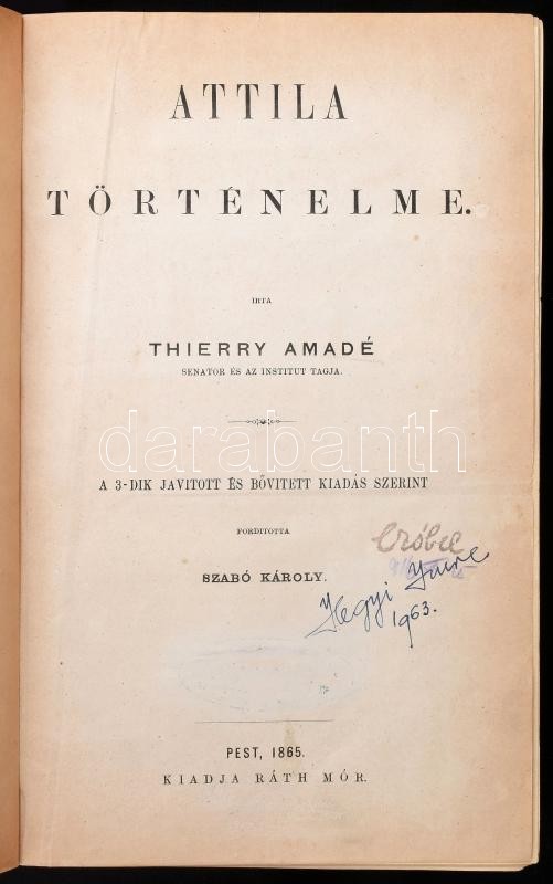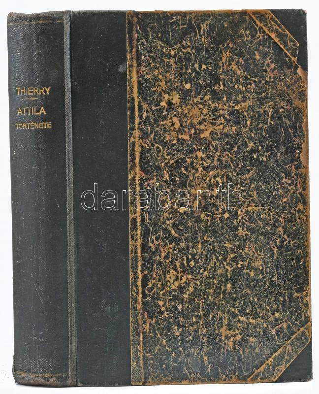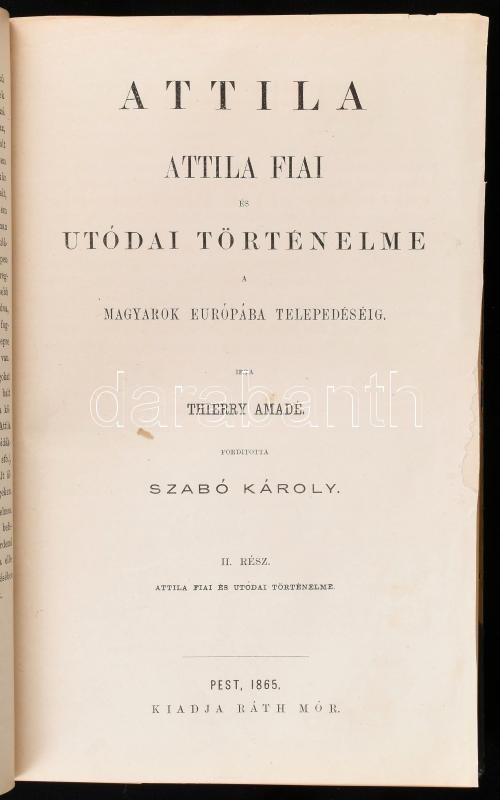 [Thierry, Amédée (1797-1873)] Thierry Amadé: Attila. Attila fiai és utódai történelme a magyarok Európába telepedéséig. I-II. rész (egy kötetben). I.: Attila történelme. II.: Attila fiai és utódai történelme. Ford.: Szabó Károly. Pest, 1865, Ráth Mór (Bécs, Holzhausen Adolf-ny.), XVI+214 p., 408 p. Félvászon-kötésben, kissé sérült, kopott borítóval és gerinccel, néhány kissé sérült lappal, tulajdonosi névbejegyzésekkel (közte "Czóbel"), régi ex libris-szel. Ritka!