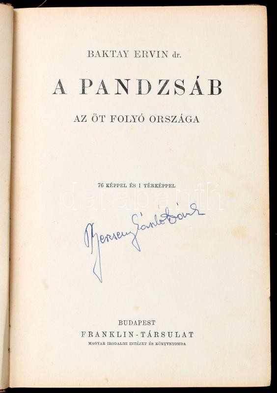 Baktay Ervin (1890-1963): A Pandzsáb. Az öt folyó országa. Magyar Földrajzi Társaság Könyvtára. Bp., é.n., Franklin, 185+3 p.+ 24 (fekete-fehér képtáblák) t. Egészoldalas fekete-fehér fotókkal illusztrált. Kiadói dúsan aranyozott félvászon sorozatkötésben, kopott borítóval, a gerincen sérüléssel.