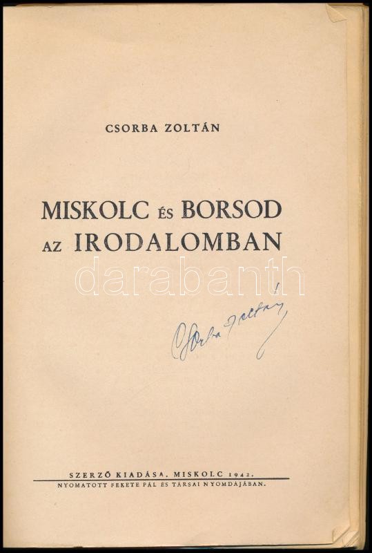 Csorba Zoltán: Miskolc és Borsod az irodalomban. Miskolc, 1942, a szerző kiadása (Fekete Pál és Társai-ny.), 160 p. Kiadói papírkötés, kissé sérült, foltos borítóval, nagyrészt szétvált fűzéssel, kijáró lapokkal. A szerző által aláírt példány!